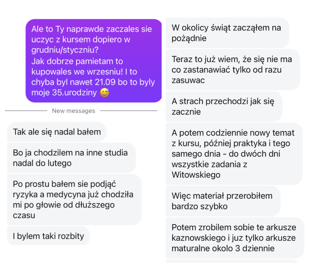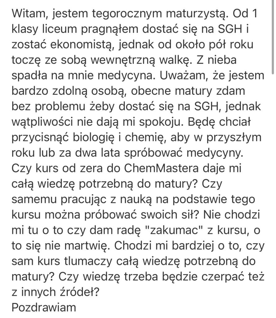 Choć wcześniej był pewien swojej ścieżki, postanowił pójść za nową pasją i przygotować się do matury z chemii – zupełnie od zera. Wybór padł na kurs ChemMaster, który kupił we wrześniu. Ale wtedy jeszcze się wahał…